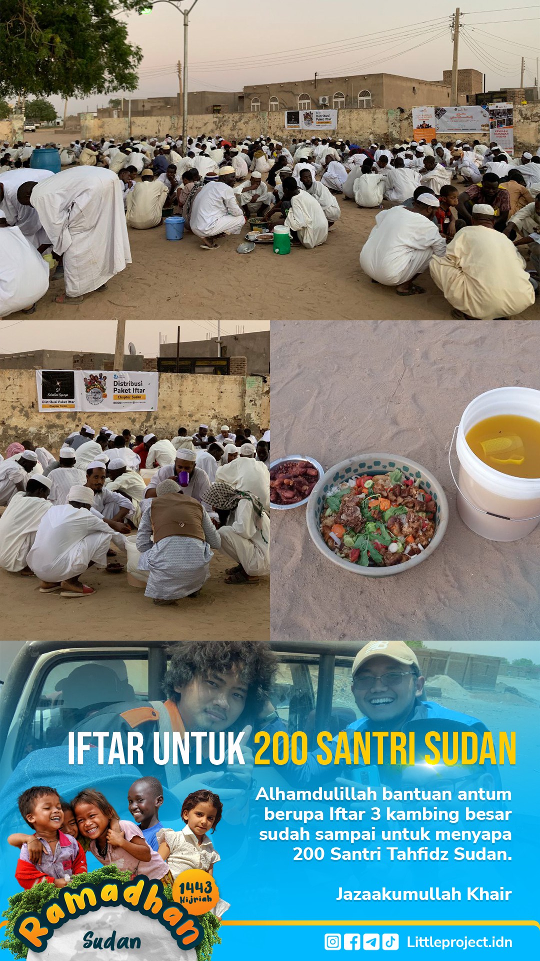 Alhamdulillah Ramadan kali ini 3 Kambing besar menjadi santapan Iftar bersama kita untuk dinikmati bersama 200 Santri Ma'had Tahfidz Wad al-Fadni Sudan. Barakallahufiikum kepada muhsinin yang terus membersamai program kebaikan Little Project